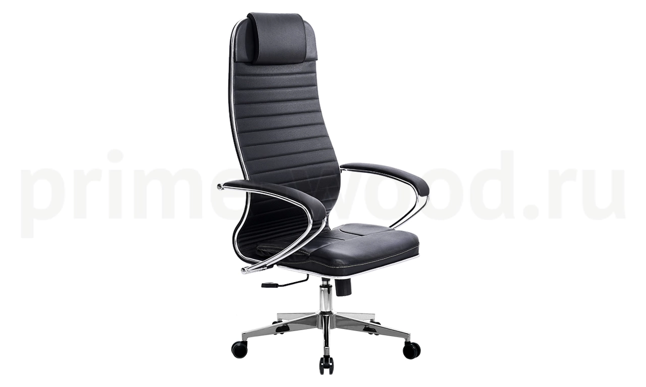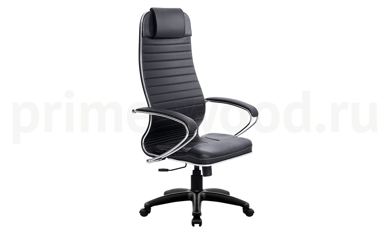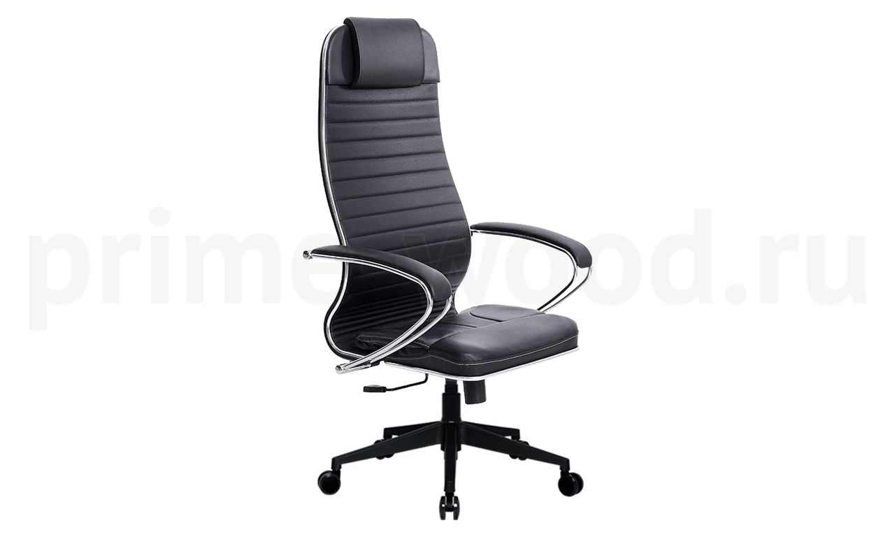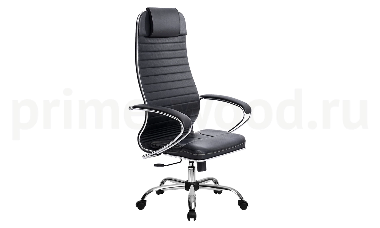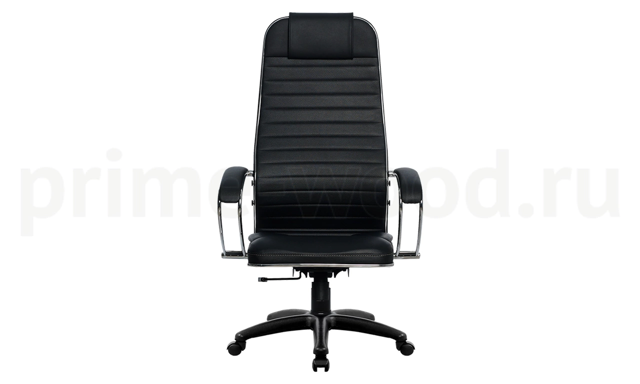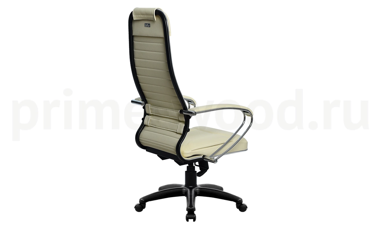 Спинка: высокая с мягким подголовником, черное полимерное покрытие каркаса с хромированным молдингом, ширина 475 мм