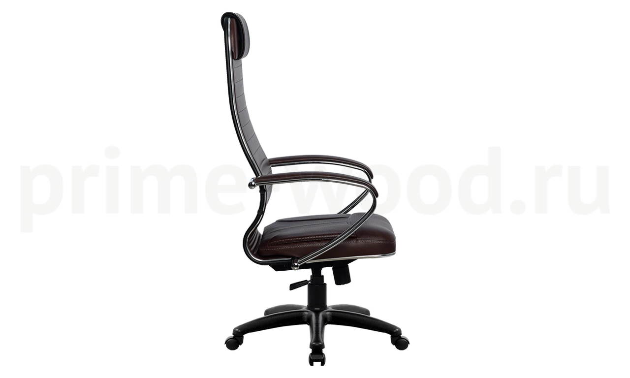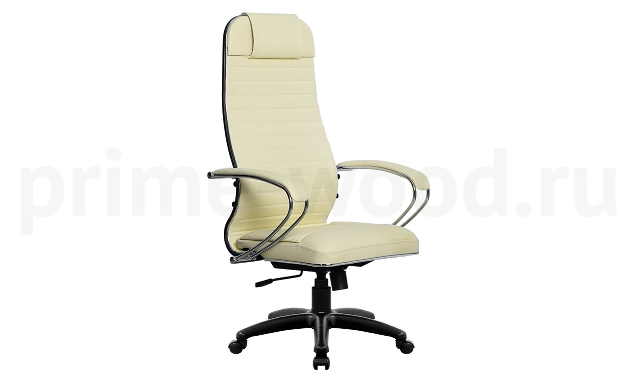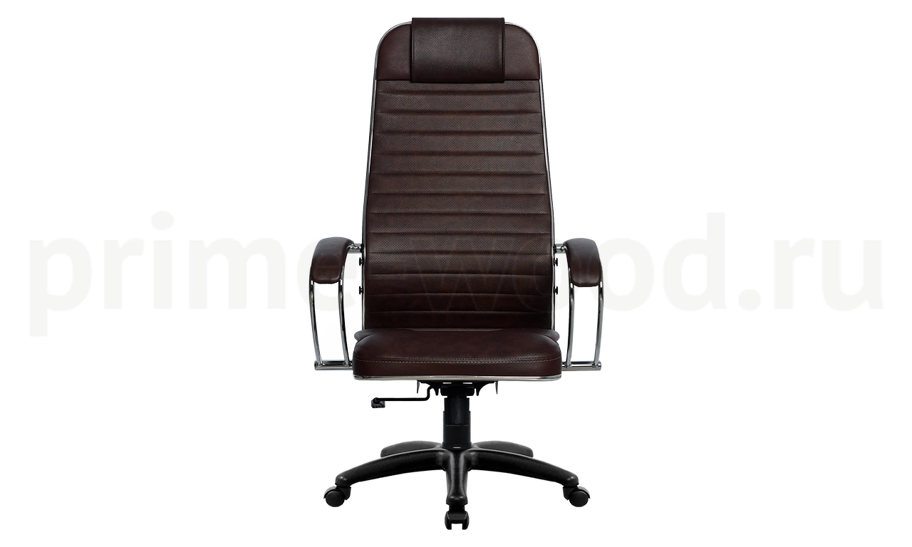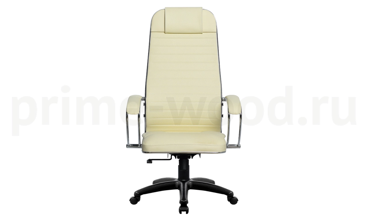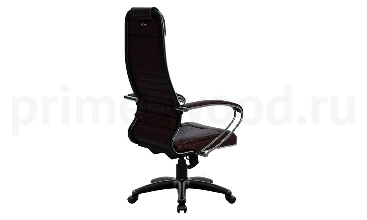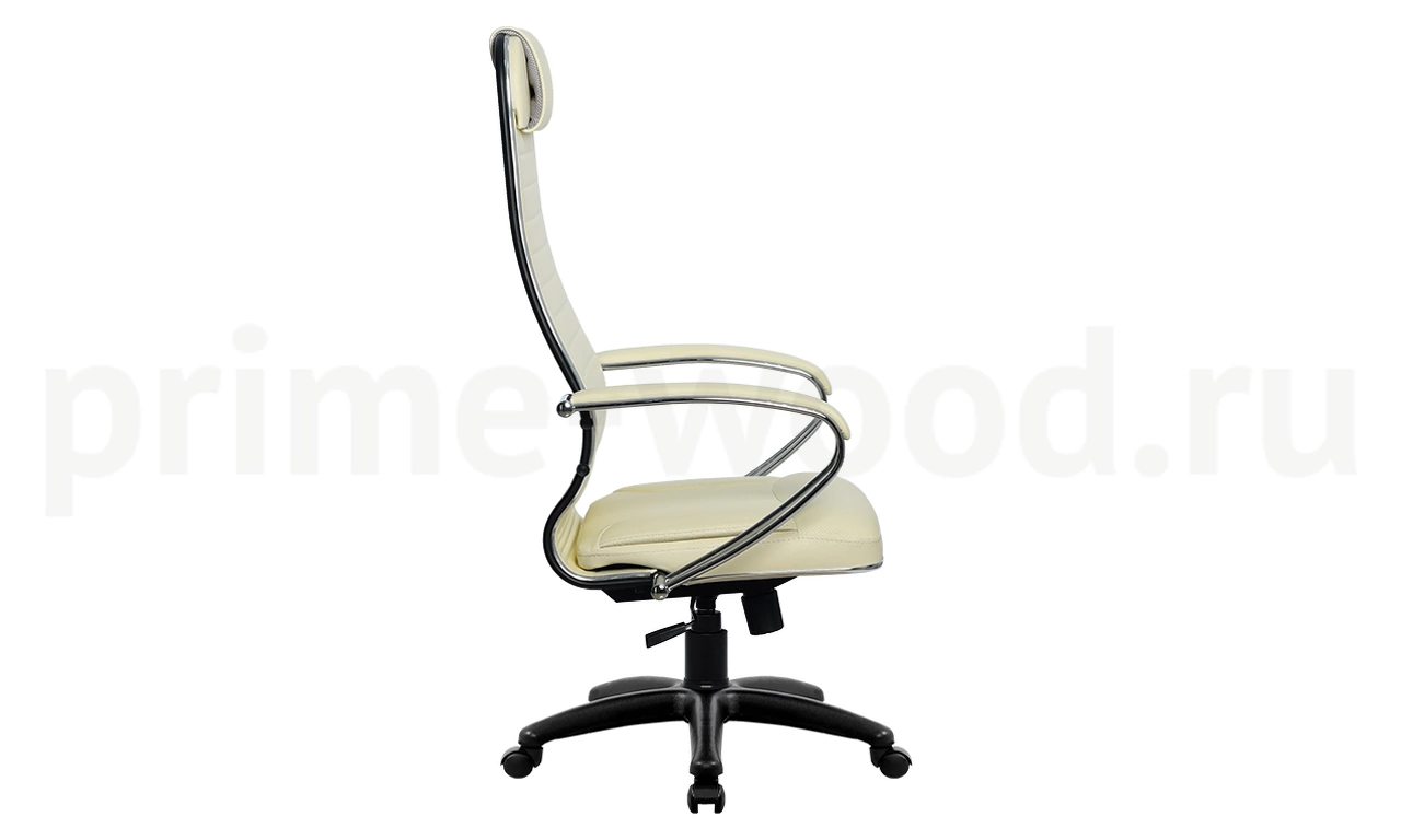 Спинка: высокая с мягким подголовником, черное полимерное покрытие каркаса с хромированным молдингом, ширина 475 мм