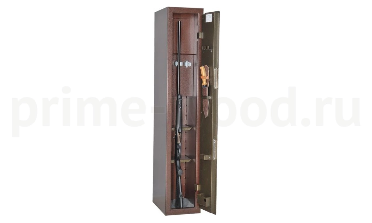 Сейф односекционный, на 3 ствола оснащен съемными полками, отделением под патроны и «Тайником». Ложементы — металлические держатели с резиновыми роликами. Максимальная высота устанавливаемого оружия — 1380 мм. Три замка.