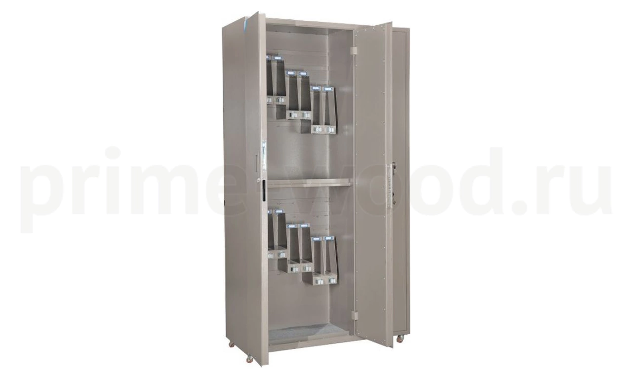 Сейф оружейный на 52 ствола: 16 автоматных и 36 пистолетных. Высота ствола от 360 до 680 мм. Ложементы — металлические держатели с резиновыми роликами. На каждой двери установлена рамка под опись.