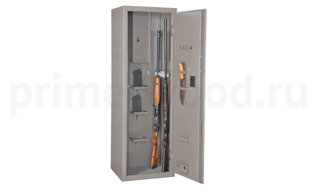 Шкаф односекционный, на 6 стволов оснащен съемными полками и отделением под патроны. Максимальная высота устанавливаемого оружия — 1380 мм. Ложементы — металлические держатели с резиновыми роликами. В дверь установлены кодовый электронный замок «Duotai» и ключевой замок.