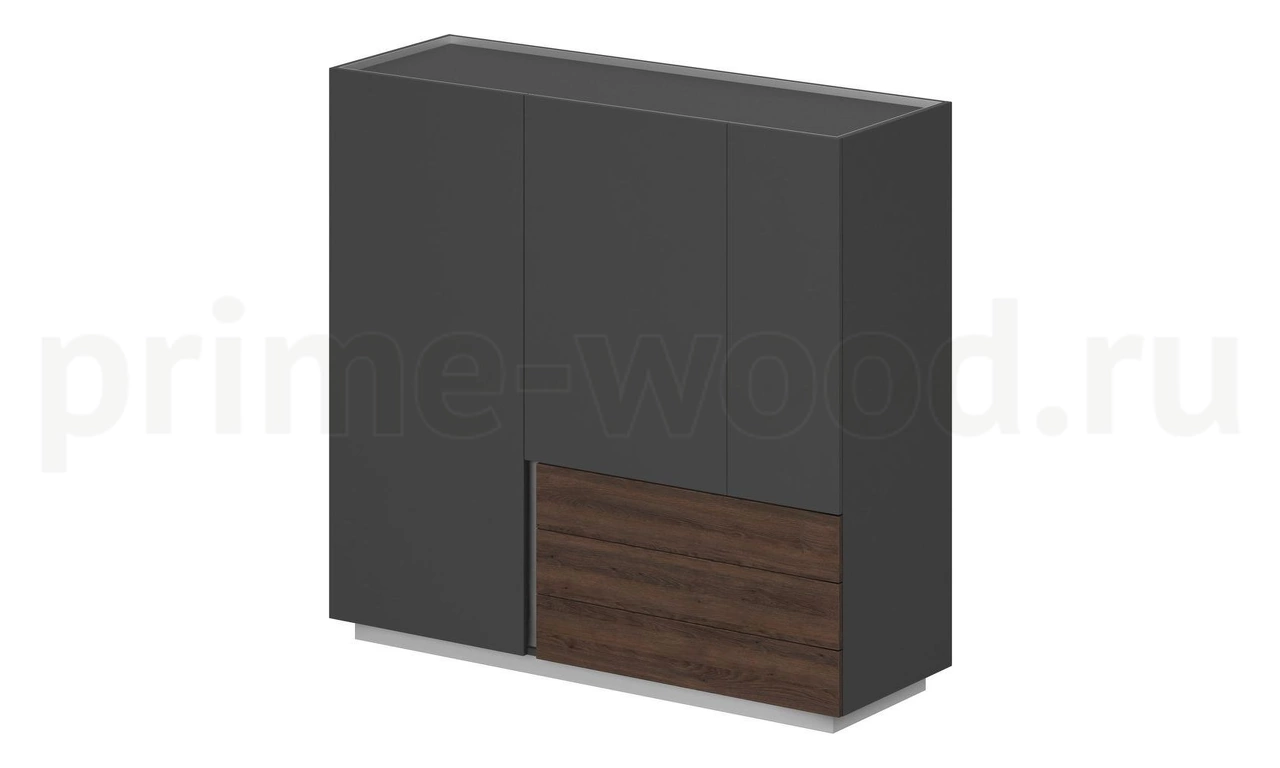 Петли (Hettich) с доводчиками. В секции за высоким распашным фасадом одна съемная полка. Присадка под полку с доп. перфорацией +- 32 мм. Верхняя, выступающая над топом, часть боковин и задней стенки имеют декоративные планки из анодированного алюминия. Наружные боковины и задняя стенка из ЛДСП 18 мм в кромке ПВХ 2 мм только по верхнему торцу, текстура вертикально. Внутренние боковины, дно, топ, перегородки и полки, детали ящиков из ЛДСП 18 мм "Оникс серый". Декоративная вставка в проеме для открывания двери серого цвета. Направляющие ящиков шариковые полного выдвижения скрытого монтажа (Hettich) с доводчиками. Подиум высотой 60 мм серого цвета.